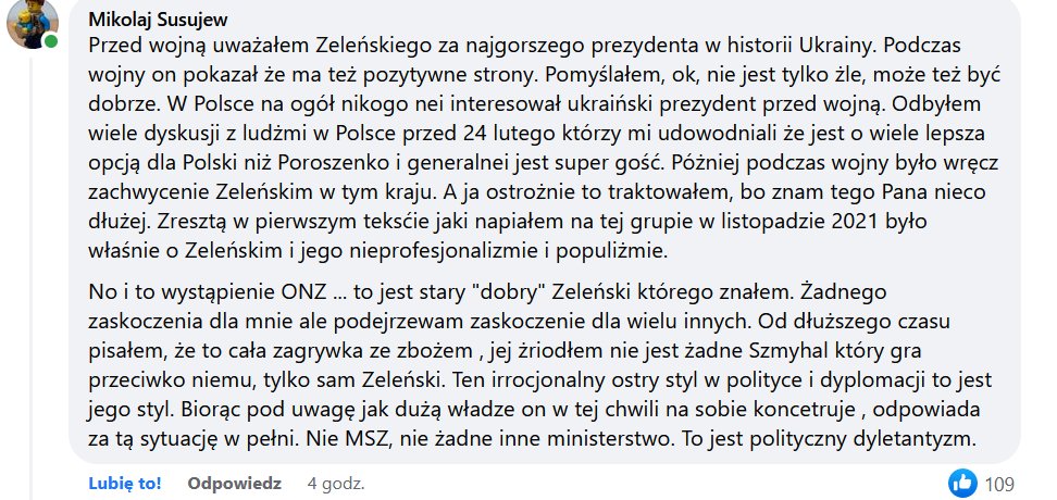 I tak, po niezbyt szczęśliwym przemówieniu prezydenta Zełeńskiego na forum ONZ, na co dostał szybką ripostę od prezydenta Dudy (jeden z ukraińskich komentatorów przytomnie zauważył, że tekst wystąpienia polskiego prezydenta był przecież napisany wcześniej, a nie na kolanie) uruchomiła po stronie ukraińskiej szybką i krytyczną reakcję. Oczywiście, są komentarze o "zdradzie Polaków", ale większość komentatorów studzi nastroje, a jest to trudne. Jeden z nich pod swoim propolskim tekstem dostał takie komentarze, że w następnym wpisie się tłumaczył, że "owszem, Polacy też na pomocy nam zyskują, ale musimy mieć świadomość konsekwencji konfliktu z nimi".